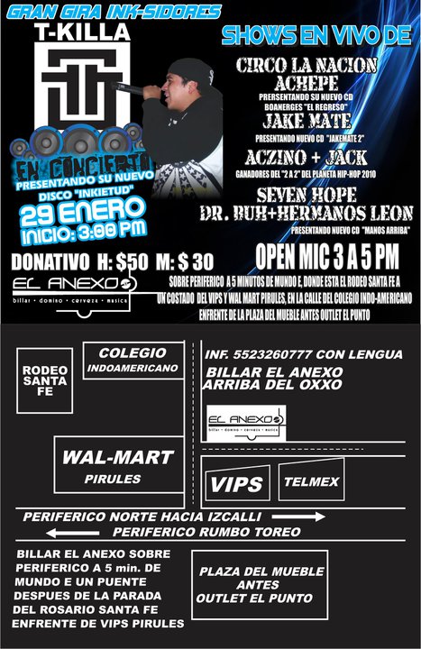 Gran gira INK-sidores | 29 enero 2011 January 29, 2011 1 min read by MazPlata Archivo de Eventos Previous Naucalpan grita | 29 enero 2011 Next Descarga: Black Prophecy & Black Team | La Black Massacre