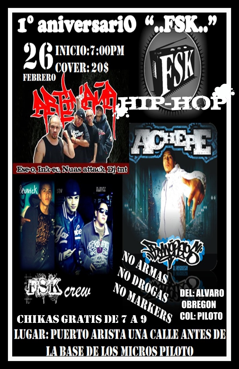 1er aniversario FSK | 26 febrero 2011 February 26, 2011 1 min read by MazPlata Archivo de Eventos Previous Escribiendo mi nombre en alto | 26 febrero 2011 Next T-killa en Toluca | 26 febrero 2011