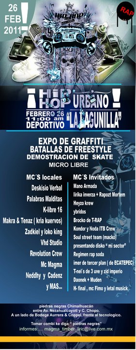 Hip hop urbano | 26 febrero 2011 February 26, 2011 1 min read by MazPlata Archivo de Eventos Previous QuilomboArte presenta: Palabreando 2011 Next Escribiendo mi nombre en alto | 26 febrero 2011