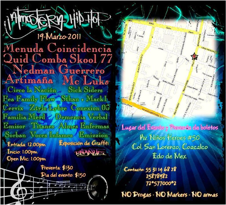 Atmosfera hip hop | 19 marzo 2011 March 18, 2011 1 min read by MazPlata Archivo de Eventos, Graffiti Previous 2do aniversario PA Crew | 18 marzo 2011 Next Descarga: Kuatro P | Hits de la caja