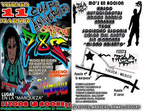 Cuarto aniversario de ??? crew | 11 marzo 2011 March 7, 2011 1 min read by MazPlata Archivo de Eventos Previous Batallas de freestyle | 6 marzo 2011 Next Video: DJ Premier vs Pete Rock | Round 1 – En Vivo