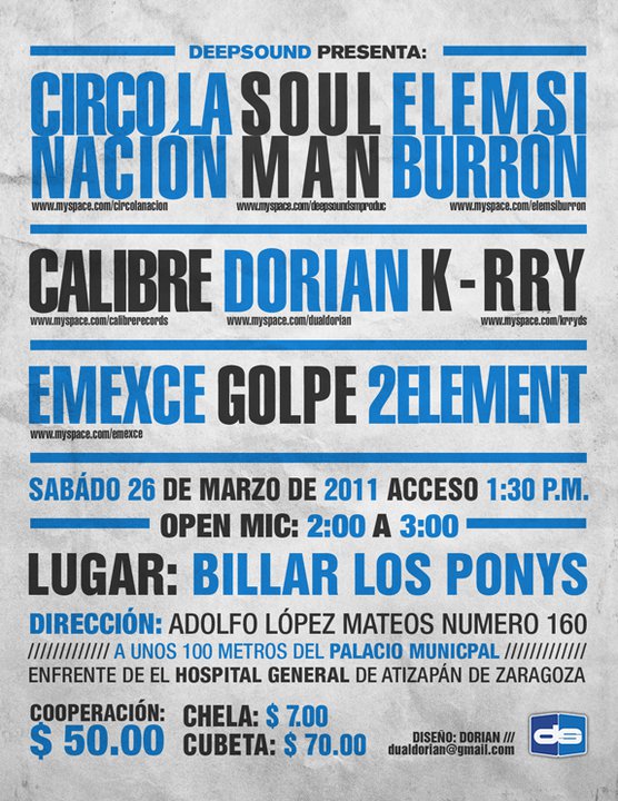 Deepsound presenta: | 26 marzo 2011 March 26, 2011 1 min read by MazPlata Archivo de Eventos Previous Concurso: Boombox Hip Hop Show | 5 boletos para los aldeanos Next Chicas sobre la tarima 3 | 26 Marzo 2011