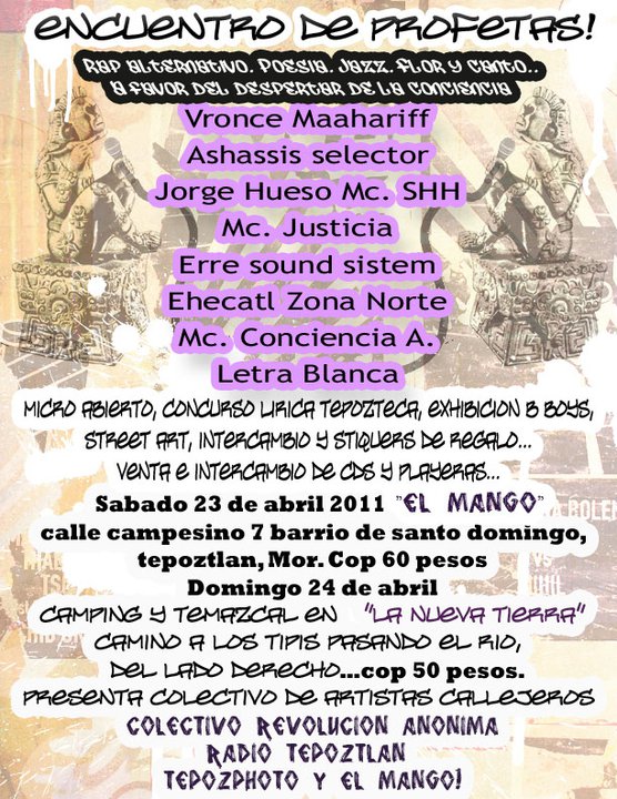 Encuentro de profetas | 23 abril 2011 April 23, 2011 1 min read by MazPlata Archivo de Eventos Previous BreakDance | 22 abril 2011 Next Hip hop en Texcoco | 23 abril 2011