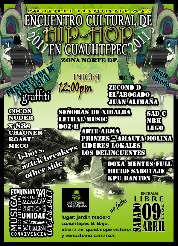 Hip hop en Cuauhtepec | 9 abril 2011 April 9, 2011 1 min read by MazPlata Archivo de Eventos Previous Descarga: Elphomega | Phantompop Next Battle City Vol.III | 10 abril 2011