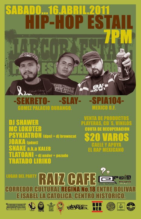 Hip-hop estail | 16 abril 2011 April 15, 2011 1 min read by MazPlata Archivo de Eventos Previous Concurso: Ilegal Squad | Eptos Uno – El Despegue – Mixtape Next Descarga: Looptroop Rockers | Professional Dreamers