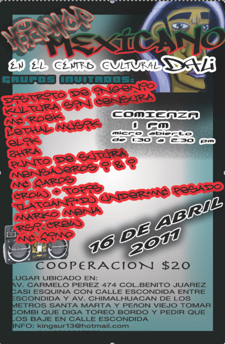 Hip hop mexicano en centro cultural Dali | 16 abril 2011 April 16, 2011 1 min read by MazPlata Archivo de Eventos Previous Hip hop en Oaxaca | 16 abril 2011 Next Expresión Urbana 8 | 16 y 17 abril 2011
