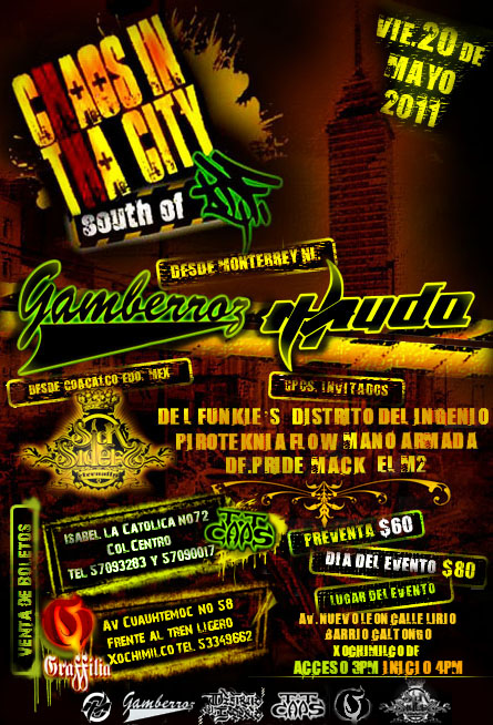 Chaos in tha city south of D.F. | 20 mayo 2011 May 20, 2011 1 min read by MazPlata Archivo de Eventos Previous Descarga: Sadrax al Guetto (Achepe y Hadrian) | Con Soul Next Res Festival 2011 | 20 mayo 2011