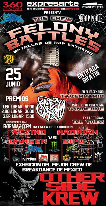 Todos los interesados en el freestyle y las batallas, pongan atención: El próximo 25 de junio se llevará acabo Felony battles, batallas de rap extremo. las inscripciones serán a partir de las 10 de la mañana en el Domo deportivo Metropolitano, calle Alameda central s/n, esquina calle bellas artes colonia metropolitana 2a sección en Ciudad Nezahualcoyotl, México a 20 minutos del metro Pantitlan. Los premios para el 1er lugar será de $5,000 pesos en efectivo, 2do lugar $3,000 y 3er lugar $1,500. Además de la batalla de exhibición de Aczino vs Hadrian y Sipo vs Danger. En la parte del lineup Tabernario desde Guadalajara, en las tornas representando Monterrey Dj Tocadiscos Trez. No dejen de asistir a este gran encuentro de freestyle 2011.
