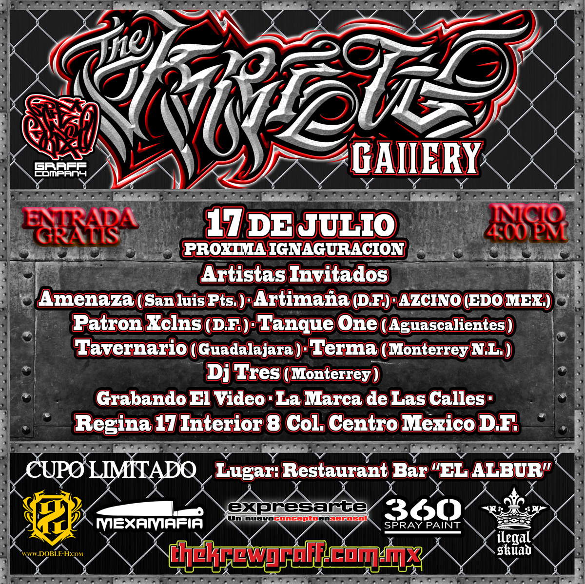 The Krew es la marca nacional con un concepto de arte graffiti en la ropa, con motivo de su inauguración de su galería en el centro del D.F. El próximo domingo 17 de Julio los invita al showcase con Artimaña, Amenaza (San Luis Potosí), Ac Zino, Patron XCLNS, Tavernario (Guadalajara) y Dj Trez (Monterrey) La entrada es totalmente gratuita y la cita es Regina No 17 Interior 8 Col. Centro en el restaurant bar “El albur” en punto de las 4:00 hrs. Además de que queda abierta la invitación a los asistentes para que formen parte del video “La marca de las calles” The Krew les invita a ir vestidos con una playera negra y apoya a esta marca hecha de nosotros para nosotros.
