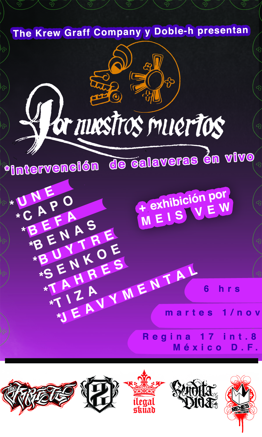 Doble-H.com y The Krew graff company, la marca de las calles los invitan a que asistan el próximo 01 de noviembre a celebrar a nuestro modo de vida hiphop una de las principales tradiciones de México el dia de muertos. “Por nuestros muertos” va hacer una ofrenda típica de México pero que incluye los elementos del graffiti dentro de ella, con customización en vivo de calaveras de los mejores representantes del D.F. como Une, Capo, Dr. Befa, Benas, Buytre, Senkoe, Thares, Tiza y Jevimetal además de la pinta en vivo de Meis de los Vew crew exponiendo su realismo de calidad.
