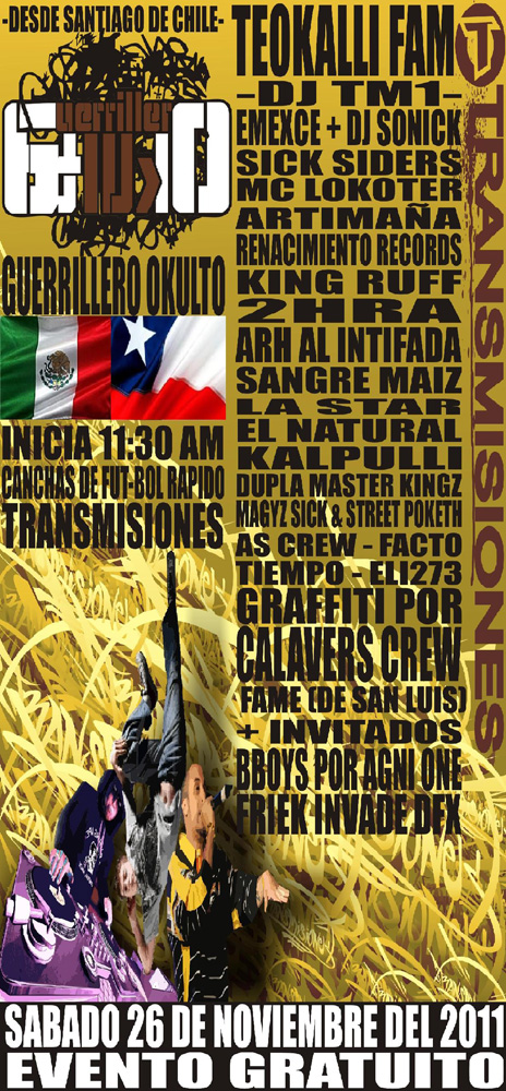GuerrillerOkulto | 26 noviembre 2011 November 26, 2011 1 min read by MazPlata Archivo de Eventos Previous Festival hip hop unión | 26 noviembre 2011 Next Graffiti: Fanzine | APC crew