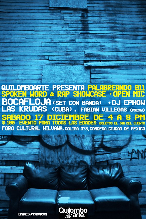 QuilomboArte Presenta: Palabreando | 17 diciembre 2011 December 17, 2011 1 min read by MazPlata Archivo de Eventos Previous Videos: Hip Hop | Diciembre 2011 Next Festival Planeta Hip Hop II | 17 diciembre 2011