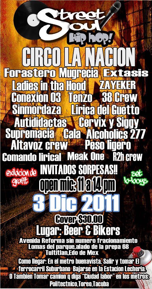 Street out hip hop! | 3 diciembre 2011 December 3, 2011 1 min read by MazPlata Archivo de Eventos Previous Black Staila presenta | 3 Diciembre 2011 Next On the wheels of steels | Del 2 al 4 de Diciembre 2011