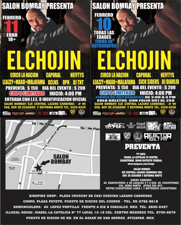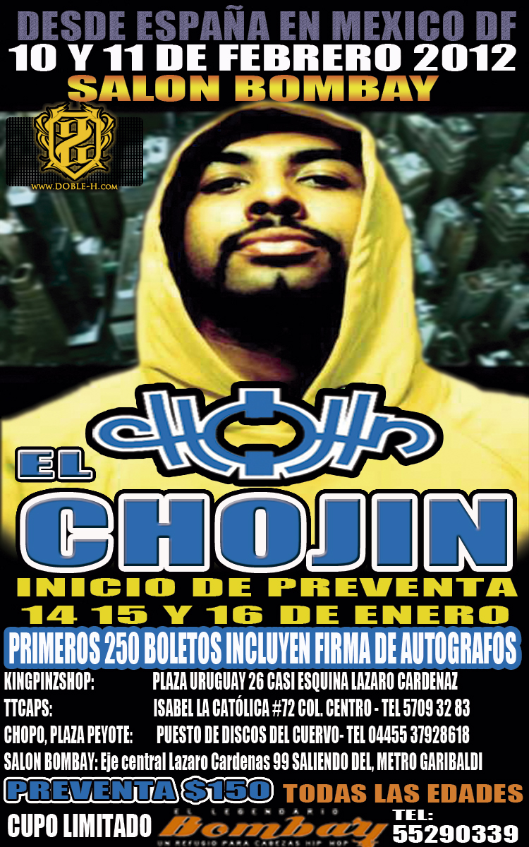 El Chojin vuelve a México y este 14 y 15 de enero comienza la preventa de boletos en el salón bombay Eje central Lázaro Cárdenas No 99 A una cuadra del metro Garibaldi, plaza peyote en el puesto de cd’s del cuervo y Kingpinz shop Plaza Uruguay No 26 esquina eje central. Los primeros 250 boletos numerados tendrán acceso a la firma de autógrafos con el mc español.