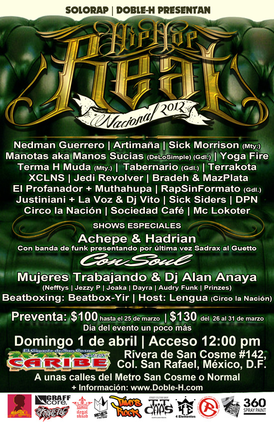 Hip hop, seis letras que han dado cierta identidad a millones de personas alrededor del globo, creando a la vez millones de maneras de sentirlo y expresarlo. Hoy buscamos un espacio más para él, en un ambiente íntimo en el que los principales protagonistas seremos todos los presentes el día 1 de abril en el Hip Hop Real Nacional 2012, siendo este un evento que sólo pretende demostrar una pequeña parte Real y Actual del hip hop hecho en nuestro país, aportando el estándar de calidad que el público merece, sentado en bases sólidas que reconocen las capacidades de los involucrados en el cartel y las de SoloRap, lo que somos y lo que realmente podemos ofrecer al público general y seguidores de este gran movimiento.