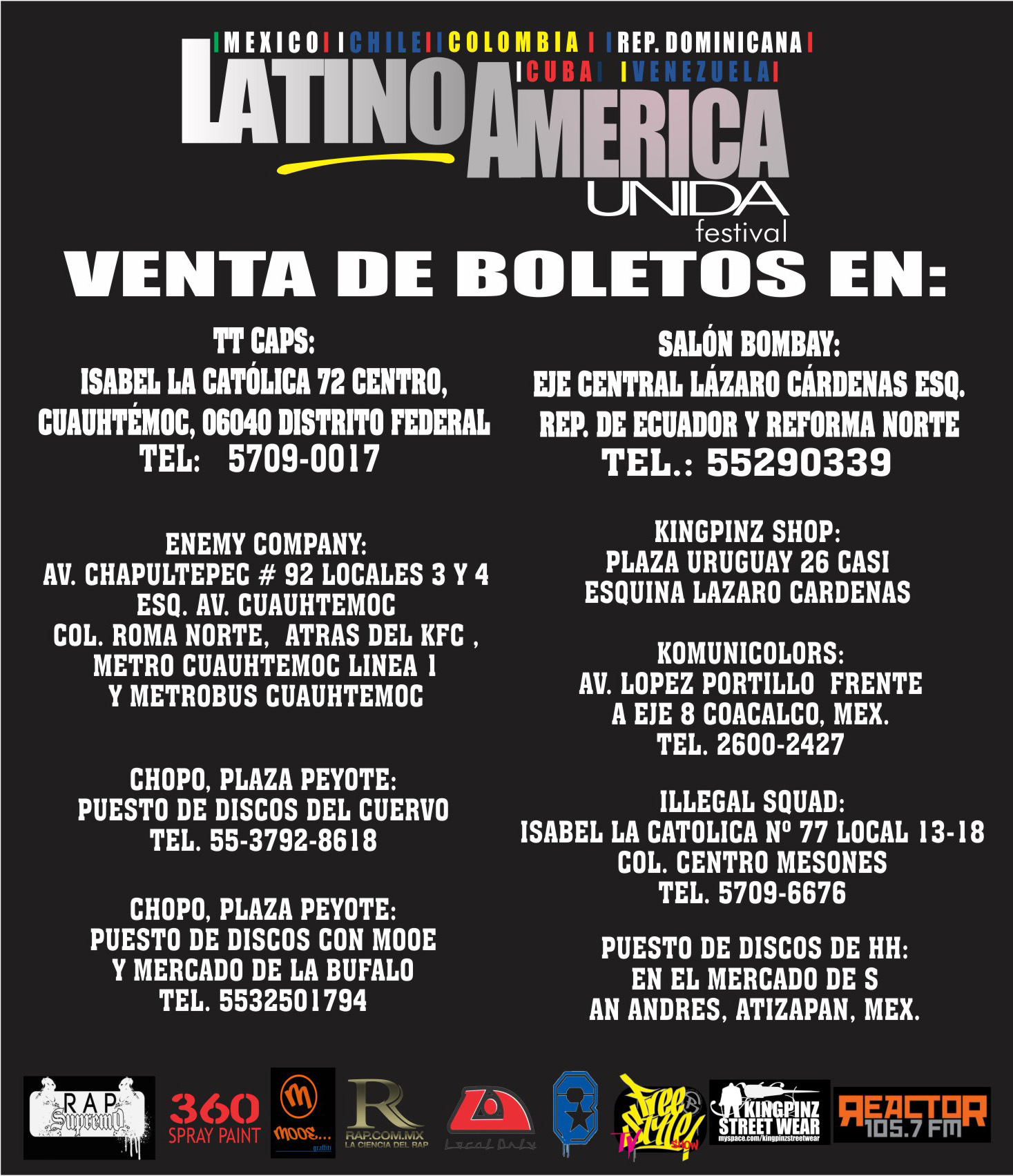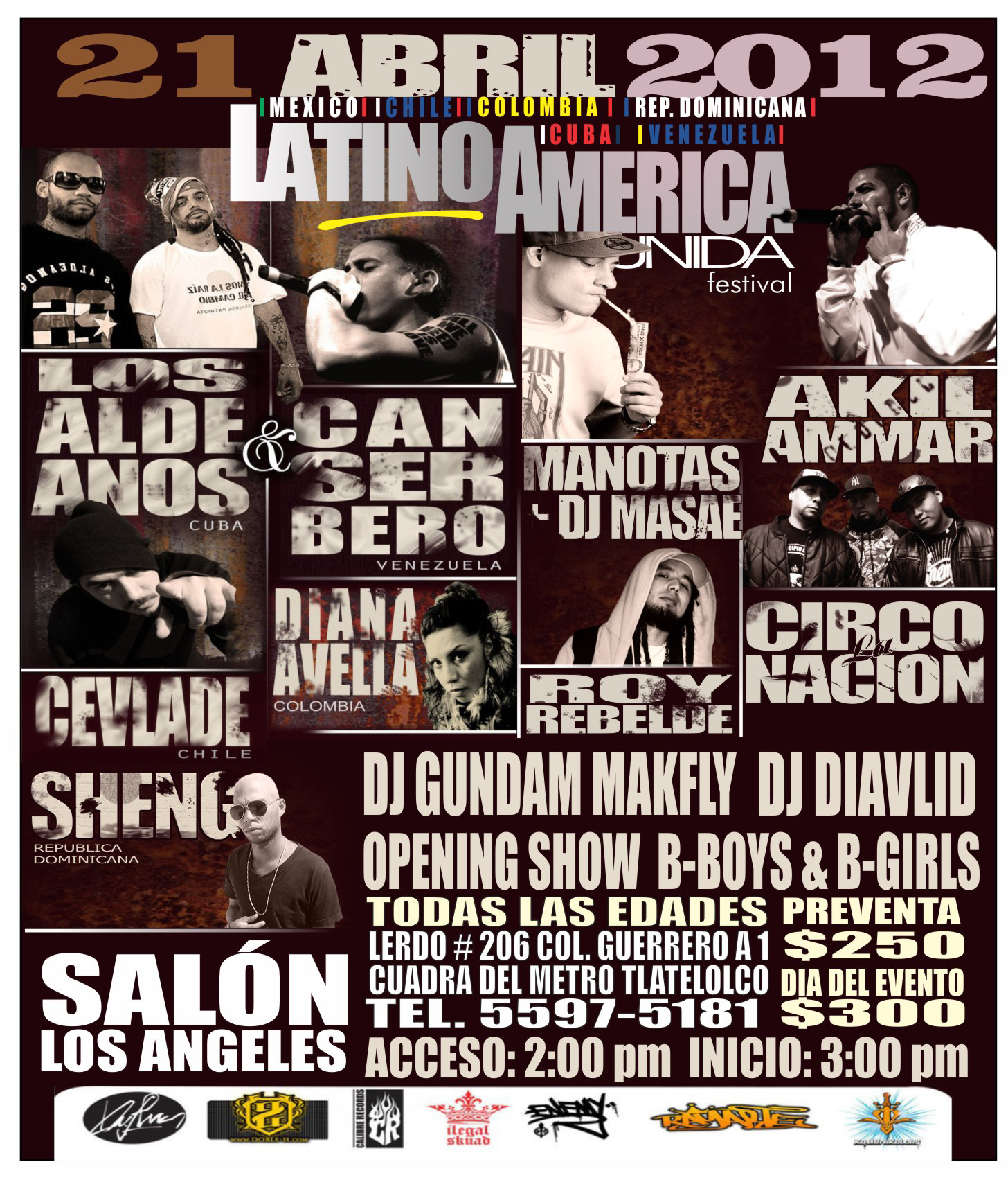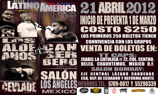 El próximo 21 de abril se presentarán varios representantes del hip hop sudamericano y de nuestro país en el festival Latinoamérica Unida, contando con un cartel que va desde Cuba, Chile, Colombia, Rep. Dominicana, Venezuela, con nombres como Los Aldeanos, Canserbero, Cevladé, Sheng y Diana Avella, así como los nacionales Akil Ammar, Circo la Nación, Roy Rebelde y Manotas acompañado de Dj Masae, además de b-boys y los Djs Diablid y Gundam MakFlay quienes amenizarán el evento con buena música.