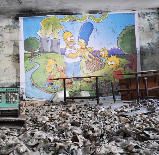 Combo se adentró en la ciudad prohibida de Chernóbil para dejar una serie de collages hechos de la publicidad y campañas de promoción de la energía nuclear, incluyendo un collage enorme en Los Simpson y la planta de energía nuclear Springfield. Ahora las paredes de la ciudad fantasma se han cubierto con los anuncios gigantes de los grandes nombres de la industria nuclear, Areva, TEPCO, GDF Suez … todo esto a tan sólo un año del último desastre nuclear ocurrido en Fukushima.