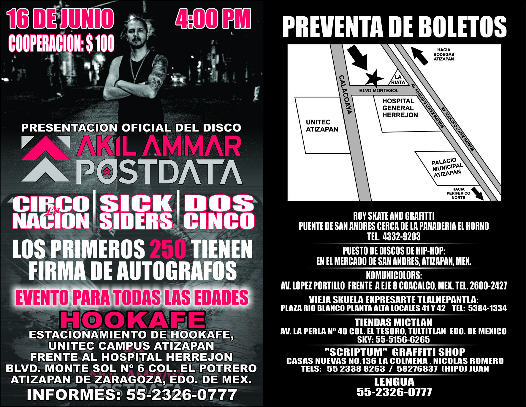 El próximo 16 de Junio Akil Ammar se estará presentando en Atizapán, edo. de México con motivo de la gira y promoción de su último dico Postdata, compartiendo escenario con Circo la Nación, Sick Siders y Dos Cinco. La cita es a partir de las 4:00 PM en Hookafe, Blvd. Monte Sol no.6, Colonia el Potrero.