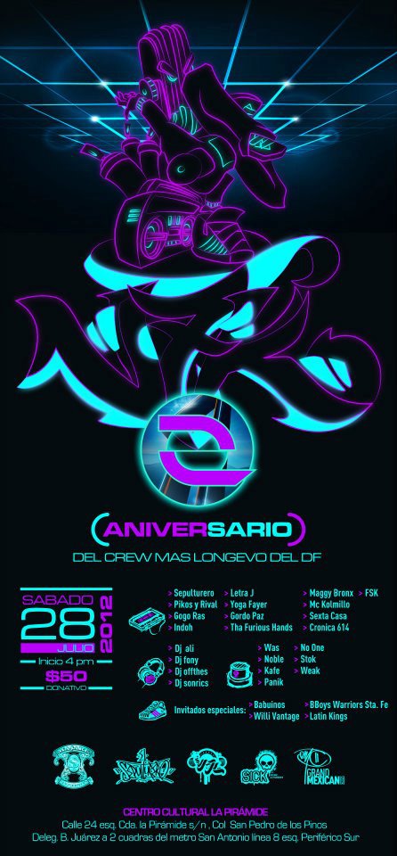 VFK cumple años, siendo este uno de los crews mas longevos y multidisciplinarios del D.F. y para celebrar, éste sábado 28 de julio realizarán una fiesta en el Centro Cultural La Pirámide a partir de las 4pm. Checa el flyer, costo e info de los invitados que estarán repesentando dentro las cuatro principales ramas del hip hop.