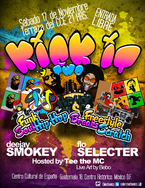 Un poco precipitado pero les dejamos esta fiesta que se llevará acabo el este sábado 17 de noviembre en la Terraza del Centro Cultural España (México, D.F.) desde la 9pm, la entrada es gratuita siempre y cuando caigas con la buena vibra para disfrutar selecto tornamesismo con funk, soul, breaks, hip hop, freestyle y más que te harán mover los zapatos; música, baile, regalos y arte en vivo de la mano de Dj Smokey (Color Mechanics, London/Mexico), Flo Selecter, Tee the MC (Color Mechanics) e Indio72, y si eres una caja de ritmos humana o bboy habra espacio para ti para que demuestres tus habilidades.