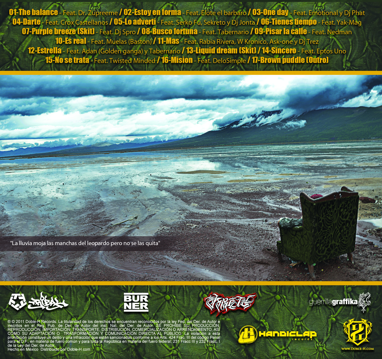 Desde Jalisco nace este proyecto de manos del productor Bial a.k.a. HandiClap, quien nos deja en descarga libre el volumen dos de Lluvia ácida. Proyecto colaborativo en el que su papel de beatmaker y productor queda englobado en un estilo lineal y sonidos clásico de hip hop para dejar fluir los textos de gente como Crox, Nedman Guerrero, Elote el Bárbaro, Tabernario, Serko Fu, Sekreto, Yak-Mag, Adan (Golden Ganga), Eptos Uno, De Lo Simple, Twisted Minded así como de los scratches de Dr. Zupreeme, Dj Phat, Dj Jonta, Dj Spro y Dj Azter.