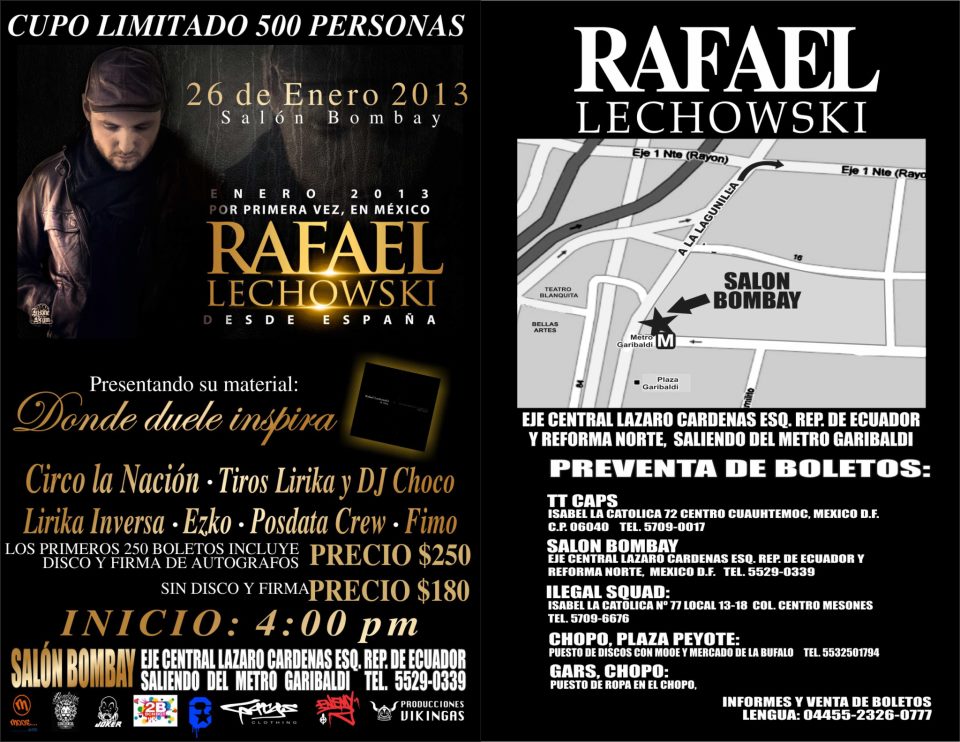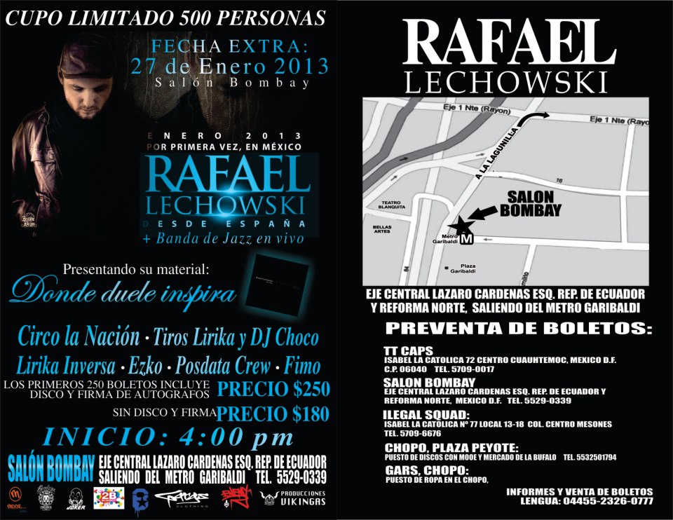 La cita es el próximo 26 y 27 de enero del 2013 en el Salón Bombay, Lazaro Cardenas 99, Col. Centro Histórico. El cupo será limitado a 500 personas, con un boletaje de valor de $250 por persona que incluye disco y firma de autógrafos (limitado a las primeras 250 personas) y $180 boleto sencillo; la preventa inicia este sábado 15 de diciembre. Podrás adquirir tus boletos en el Bombay, TT Caps e Ilegal Squad.