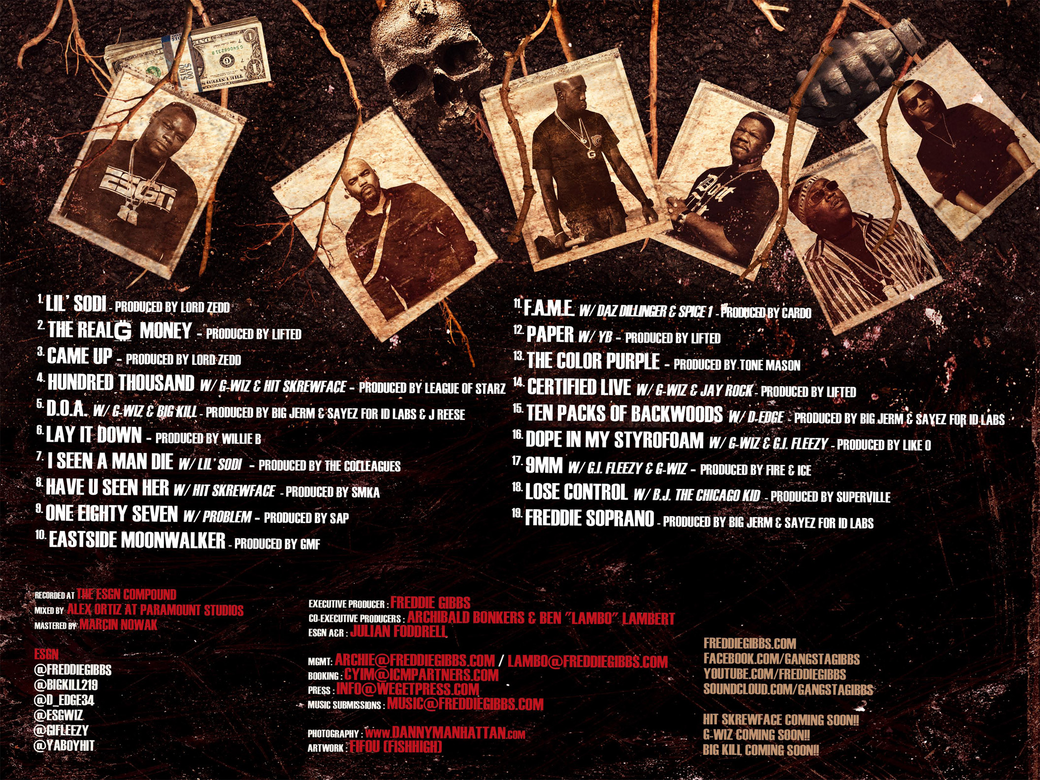ESGN son 18 tracks + 2 de la version de iTunes que nos muestran de nueva cuenta al mas “G” de estos tiempos, Gibbs se desenvuelve con la ayuda de BJ the Chicago Kid, Daz Dillinger, G.I. Fleezy, G-Wiz, Jay Rock, Problem y Spice 1 y en los ritmos principalmente de Trap estan Big Jerm, Cardo, Sap, Sayeez, SMKA entre otros.