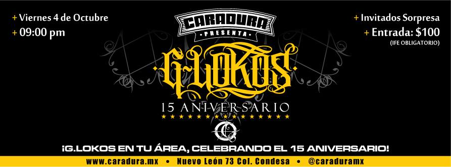 Nos informan que continúa la celebración del quinceavo aniversario de los G Lokos, y, con motivo, se llevará a cabo una presentación el próximo viernes 4 de octubre, la cita es a las 9:00 pm en el Caradura, ubicado en Nuevo León no. 73, Col. Condesa, México D.F. El costo de entrada es de $100 pesos presentando IFE.
