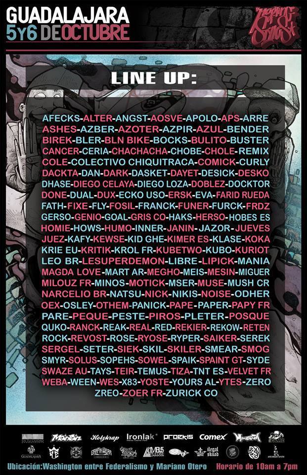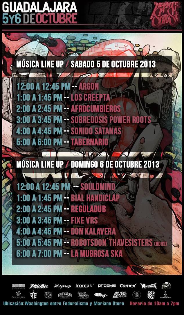 El graffiti de México esta de fiesta, el próximo fin de semana se llevará acabo el tradicional Meeting Of Style 2013 el cual se realizará por primera ocasión en la ciudad de Guadalajara. Las expectativas son amplias para los amantes del aerosol, ya que por primera vez el MOS trabaja en un esquema incluyente, dándole espacio también al graffiti ilegal. El basto cartel conformado por writers mexicanos y extranjeros será el pretexto para irnos a Guadalajara para traerles lo mejor de este magno festival. Estén atentos a las publicaciones para quien no tenga la posibilidad de asistir. También pueden darle seguimiento al facebook oficial donde están actualizando las llegadas y todo lo que necesitas saber de este evento prometedor.