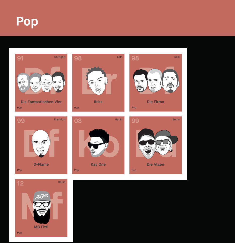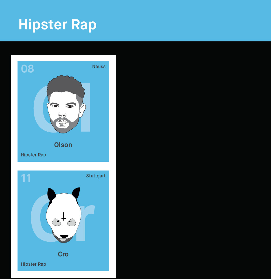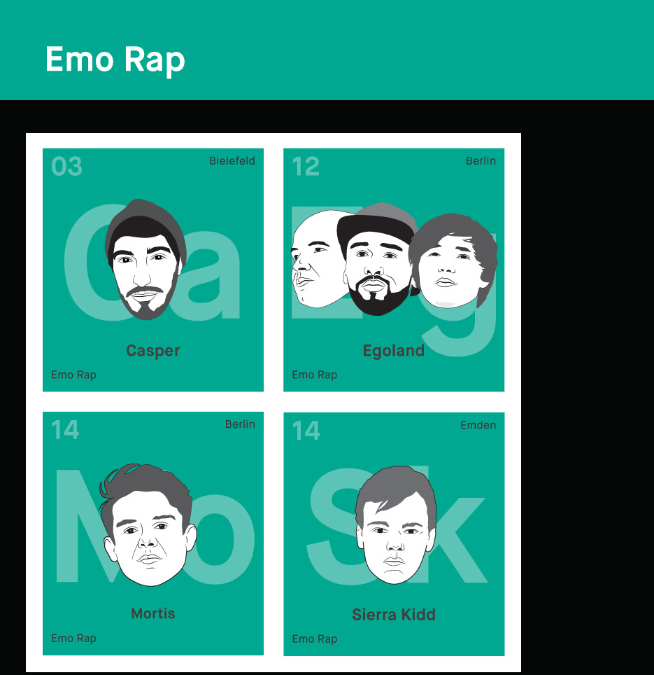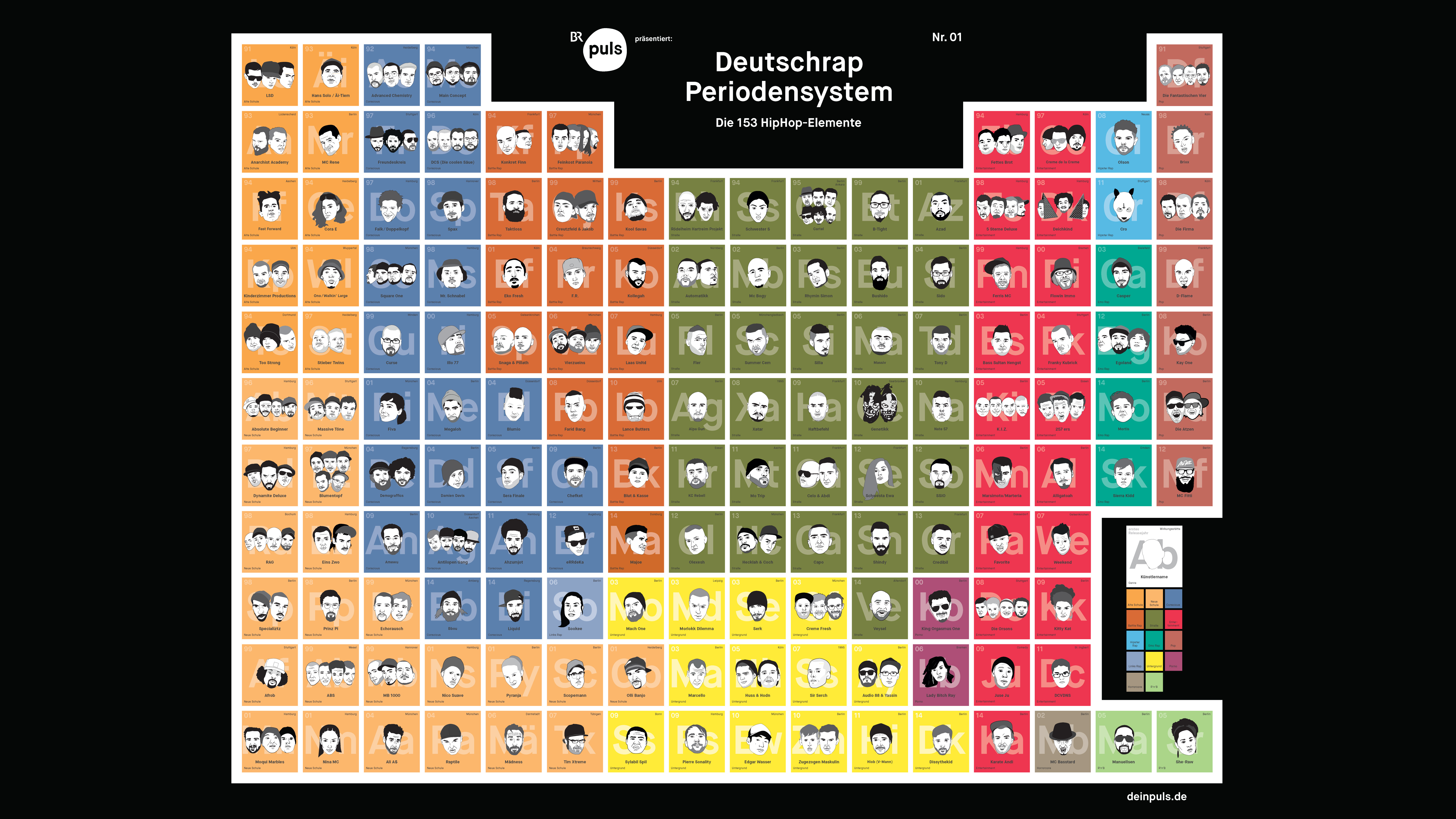 - Género: El cuadro donde ponemos los elementos depende de su estilo musical y su entorno. Una vez más, el género fue reelegido, con el que el artista era conocido correctamente. Por ejemplo, Frauenarzt,originalmente podría ser asignado al underground/porno rap, pero ahora está con Die Atzen haciendo carrera en las grandes discotecas, y por lo tanto aterrizó en la tabla periódica en pop. Casi ninguno de los rappers que aparece le corresponde a un solo género. Como siempre, el tipo de música ideal para categorizar también incluye la impresión subjetiva, por lo tanto, hemos optado por el género en el que el artista se adapta mejor para nosotros.