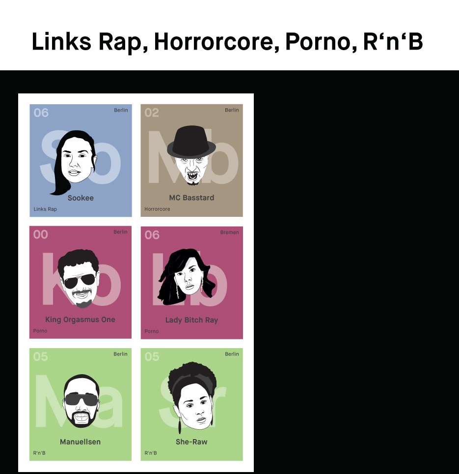 Estos cuatro géneros son fenómenos bastante marginales en el rap alemán. Vamos a comenzar con Sookee, quien en al tabla periódica representa el rap político de izquierda, o como se le conoce por otros lados: Zeckenrap.