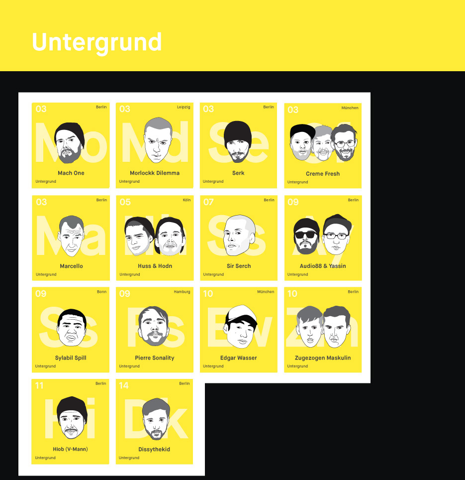 - Crews: Si un rapper es conocido en grupo tanto como en su grupo, se enumeró de acuerdo al crew, no al artista en solitario. Por ejemplo, Die Orson tomó a Plan B, pero Sido toma a Die Sekte .