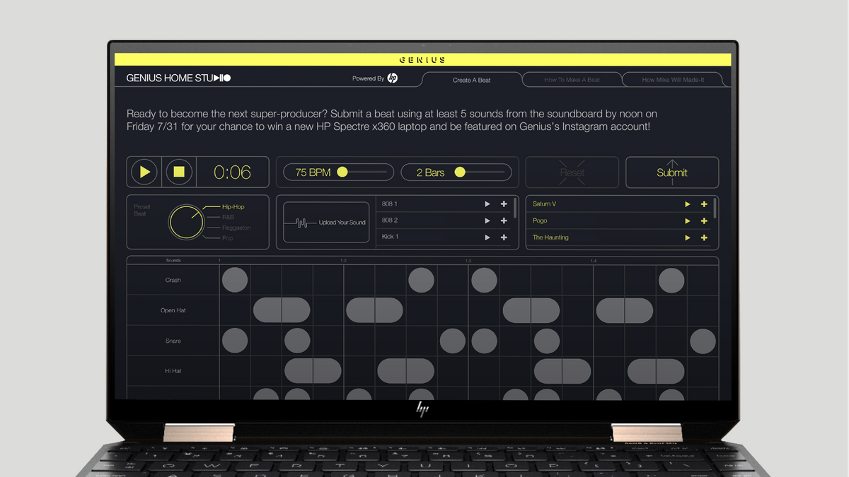 La mítica song lyrics base actualmente conocida como Genius, tras su cambió de nombre, nuevas integraciones a la plataforma e introducirse como un medio de comunicación digital, continua buscando las formas de innovar año con año, este no es la excepción invitándonos a un concurso en asociación con la marca HP para ganar una laptop Spectre x360. El concurso va dedicado a los beatmakers o cualquier persona que pueda marcarse un ritmo con la DAW online que desarrollaron para esto y que lleva el nombre de Genius Home Studio.