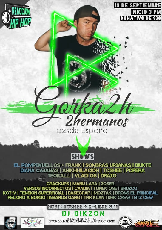 El próximo 19 de septiembre estará en la CDMX presentándose Gorka2H del grupo madrileño Doshermanos. La sita es es a las 3pm en el Foro Mictlan, Simón Bolivar 283, Col. Obrera, Alcia. Cuauhtémoc. La tarde estará acompañada también de puesta en escena de El Rompekuellos, Frank, Sombras Urbanas, Biukte, Diana Cabañas, Anikhhilacion, Toshee, Popera, Teokalli entre otros.