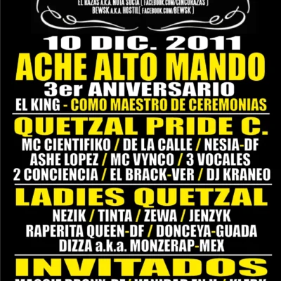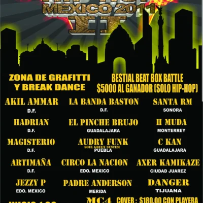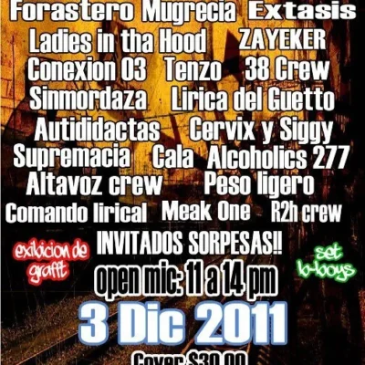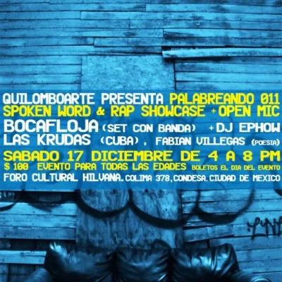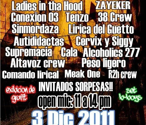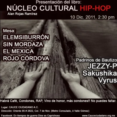 10 de Diciembre 2011 Cauce Ciudadano, A tres calles el metro Consulado, sobre oriente 85. Presentación del libro: Núcleo Cultural Hip-Hop (En tiempos de guerra, Dios es caprichoso). Presentan: Elemsiburrón (Felipe León) Sin Mordaza (periodista) El Mexica (Mexico Sur Centro, Rapem) Rojo Córdova (poeta eSLAMero) Padrinos de Bautizo: Jezzy-P Vyruz Testigos: Sakushika Magnolia Ridaz QUÉ […]