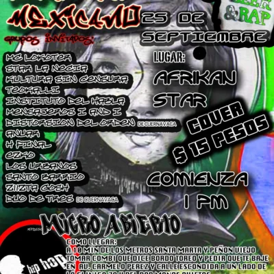 18 Septiembre Huixquilucan Estado de Mexico Caiganle Banda!! 18 de Septiembre !Viva MeHip Hop¡ 2 PM Cover 15 VaritoS… Opne Mic. En la Casa: Zangre Negra La Prolongación Ydeal El Apzoluto XXX Funk Radical Stilo Naipe Cultura Sin Censura Fenix RSH Alex Veneno + Sil Sil Jovelz Boster Dean (Presentando neuvo material) Chuko A.K.A Raplbert […]