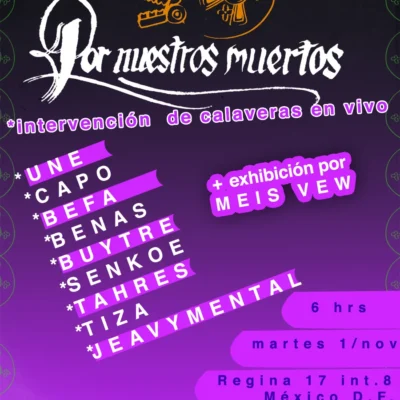 Por nuestros muertos fue la ofrenda que presento The Krew Graff company en colaboración con Doble-H.com e Ilegal Squad con la participación de Meiz Vew, Senkoe, Une, Tysa, Dr. Befa, Benas, Jeavi Mental, Thares, Capo y Buytre. Por primer año consecutivo The krew une una de nuestras tradiciones rindiéndole culto al hiphop y los pioneros que se […]
