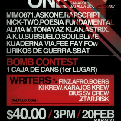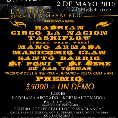 Fecha: 13 junio 2010 Hora: 4:oo pm Costo: Entrada gratuita Lugar: Salón de Alba Dirección: ??? Comunicado de Tankeone: ke ondas los invito al monster verbal combat un torneo de batllas a nivel nacional, el premio son 13,500 para el primer lugar ,6000 para el segundo,sera en aguascalientes el 13 de junio de este año […]