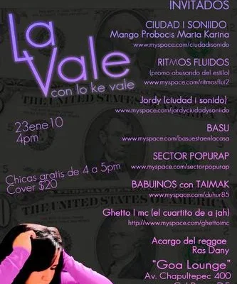 Fecha: 23 enero 2010 Hora: 4:00 pm Costo: $20 Lugar: Goa Lounge Dirección: Av. Chapultepec, no. 400, Col. Roma